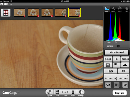 Из трех рассмотренных нами моделей именно CamRanger поддерживает наибольшее число функций управления фотоаппаратом. Бесплатное приложение CamRanger имеет множество параметров и позволяет выбирать формат изображения (Raw, JPEG или Raw+JPEG, включая файлы JPEG различных размеров), компенсацию экспозиции и режим фокусировки. Приложение переводит камеру в режим ПК (если она его поддерживает) и помогает полностью контролировать режим съемки.