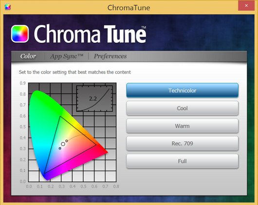 Впрочем, одним лишь цветовым пространством Technicolor пользователей никто не ограничивает. С помощью приложения Portrait Displays Chroma Tune вы можете переключаться между пространством Technicolor и цветами, адаптированными, например, для офисных приложений.
