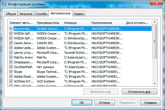 | В среде Windows 7, Vista и XP вы можете отключить автоматическую загрузку некоторых программ, сняв соответствующие флажки на вкладке «Автозагрузка» |