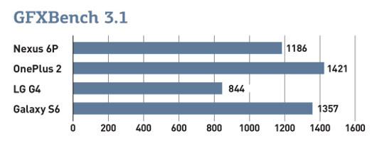 | В тесте GFXBench 3.1 оцениваются возможности трехмерной графики. Здесь Nexus 6P опять отстал от OnePlus 2 и Galaxy S6. Худший же результат, как и ожидалось, показал LG G4 с маломощным процессором Snapdragon 808 |