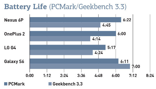 Тесты батареи Nexus 6P показывают, что ее возможности превосходят имеющиеся у большинства аккумуляторов других флагманских устройств, особенно если они находятся в том же ценовом диапазоне. В тестах PCMark батарея 6P емкостью 3450 мА . ч продержалась 6 ч 22 мин, т.е. примерно на 1 ч меньше, чем аккумулятор Note 5 емкостью 3000 мА . ч. Я думала, что результаты Nexus 6P окажутся выше, потому что телефон легко выдерживал целый день интенсивного использования, но последние модели Samsung являются безусловными фаворитами в этих тестах. В реальной же жизни к 6P претензий не было. У меня устройство продержалось целый день без перезарядки в достаточно жестких условиях эксплуатации.