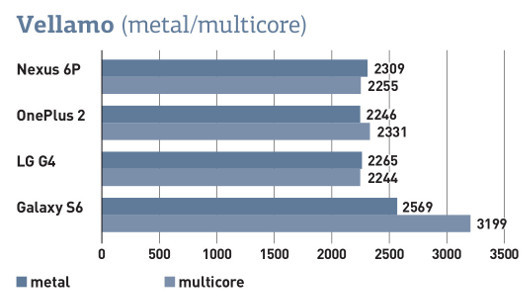 | В тестах Vellamo проверяются возможности процессора. И здесь однокристальная система Qualcomm, установленная в Nexus 6P, существенно уступила процессору Galaxy S6 |
