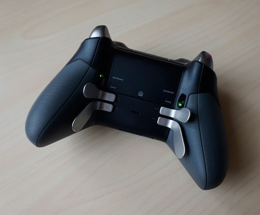 Еще одно принципиальное отличие данной модели от стандартного геймпада — наличие съемных ручек, размещенных на задней поверхности. Они по умолчанию дублируют стандартную раскладку клавиш A/B/X/Y, но им могут быть назначены и иные функции. Для этого в Windows 10 и Xbox One есть специальное приложение.