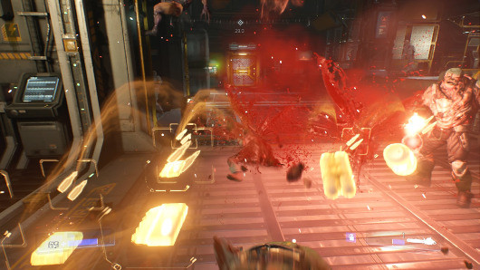 В игре мы много бродим по замкнутым пространствам, но для перестрелок нам обязательно предоставляют большую локацию. DOOM не использует принцип «беги и стреляй». Противников не бывает мало, и если они уж появляются, то численность их не менее нескольких десятков. На этом фоне странным кажется довольно малое количество патронов — не сказать, что припасов не хватает, но весьма часто нужно следить за боезапасом и не расходовать заряды напрасно. А когда становится совсем худо, наступает черед бензопилы — она удалась на славу. Красные брызги во все стороны, разрезанные тела, измазанная кровью цепь — живущий внутри игрока садист точно останется доволен. Появившееся в игре добивание противников, кстати, используется постоянно: из врагов выпадают небольшие аптечки, позволяющие быстро поправить здоровье. Фаталити не отнимают много времени, они отлично подошли к скоростному геймплею и не замедляют его.