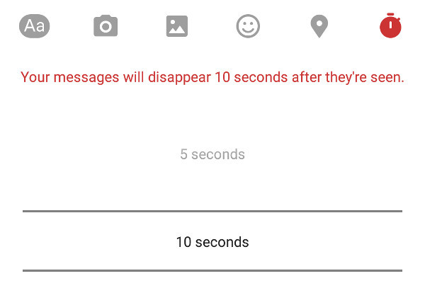 Secret Conversations также предлагает возможность самоуничтожения сообщений, подобную тому, что у Snapchat, которую вы можете настроить отдельно для каждой беседы. Начните секретный разговор и после этого нажмите на значке секундомера справа от поля ввода текста. Это позволяет определить, насколько долго ваши сообщения будут видны на устройстве другого участника беседы. Вы можете выбрать временной интервал от 5 с до одного дня либо вовсе отключить самоуничтожение сообщений.