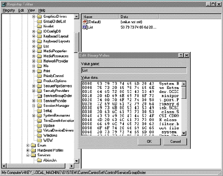 Прежде, чем I/O Manager инициализирует драйверы загрузки, он сортирует их в соответствии со значениями их параметра Group, а драйверы, для которых этот параметр не определен, помещает в конец списка. Значение Registry HKEY_LOCAL_ MACHINESYSTEMCurrentControlSetControlServiceGroupOrder определяет приоритет группы в процессе сортировки. На Экране 1 показаны значения ServiceGroupOrder. Группы в начале списка имеют более высокий приоритет, чем группы в конце списка.