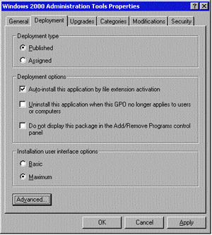 Стратегия групп, заложенная в модуль IntelliMirror, дает возможность опубликовывать или назначать прикладные программы пользователям, а также назначать приложения компьютерам. Когда администратор публикует приложение, пользователи могут с помощью значка Add/Remove Programs панели управления устанавливать его на своих машинах. При назначении приложения пользователю администратор создает на его рабочем столе значок или ссылку в меню Start. После этого пользователь может установить данную прикладную программу, выполнив двойной щелчок мышью на значке, расположенном на рабочем столе, или выбрав имя приложения в меню Start. В случае назначения прикладной программы компьютеру, эта программа устанавливается автоматически при запуске машины, после чего любой пользователь, зарегистрировавшийся на данном компьютере, получает к нему доступ.