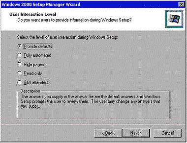 | ЭКРАН 2. Уровни взаимодействия с пользователем утилиты Windows 2000 Setup Manager Wizard. |