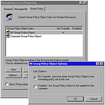 Для настройки групповых политик в операционной системе Windows NT 4.0 предусмотрены административные шаблоны (файлы с расширением adm). Windows 2000 также допускает управление настройками пользователей с помощью метода политики групп. Так, можно наложить запрет на изменение политик GPO, сформулированных для определенных объектов. На Экране 4 представлены примерные варианты конфигурации для новой стратегии группы.