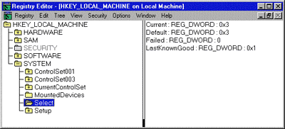 С помощью редактора системного реестра, например regedt32, можно просмотреть раздел реестра HKEY_ LOCAL_MACHINESYSTEMSelect. На Экране 2 показаны все четыре значения — Current, Default, Failed и LastKnownGood.