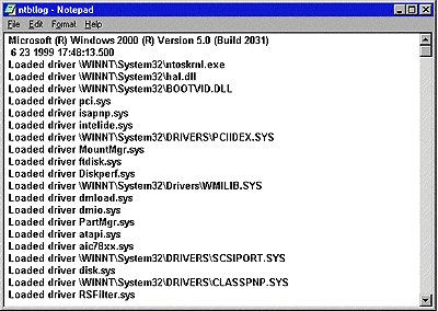 Режим протоколирования процесса загрузки. Пункт Enable Boot Logging создает в корневом каталоге системного диска файл ntbtlog.txt (см. Экран 1).