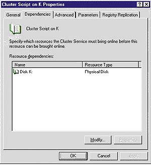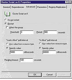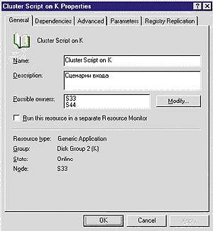 Новое месторасположение перемещаемых ресурсов - кластер Microsoft Cluster Server for Windows NT. С появлением MSCS существующую синхронизацию каталогов регистрации необходимо дополнить еще одним источником синхронизации - кластером от Microsoft. Для этого и требуется написать отдельную процедуру синхронизации файлов сценариев, т. е. создать Generic Application.