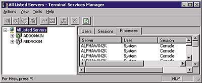 Предположим, администратор системы решил выяснить, не играет ли кто-нибудь из сотрудников в TSQuake (терминальную версию популярной игры Quake). Он запускает Terminal Services Manager, выбирает домен или сервер, информацию о котором намеревается собрать. На правой панели выводится закладка со списком пользователей, зарегистрированных на данный момент на терминальном сервере, закладка с активными и отсоединенными сессиями и, наконец, закладка со списком запущенных на терминальном сервере процессов. Эта информация позволяет определить, какой пользователь и какой идентификатор процесса (PID) ассоциирован с какой сессией, а также насколько сервер занят обслуживанием данной сессии.