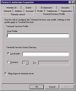 Да, администрирование некоторых настроек соединения, например информации о файле профиля или местоположении домашнего каталога терминального клиента, имеет смысл выполнять для каждого пользователя индивидуально. Хотя иногда те или иные параметры удобнее было бы настраивать для группы, к сожалению, в Windows 2000 этого сделать нельзя.