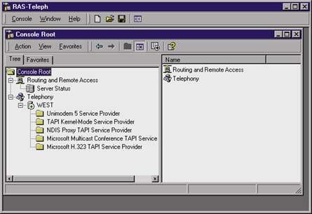 Консоль может объединять несколько интегрируемых компонентов, автоматически размещаемых по именованным контейнерам (каждый компонент создает и именует свой контейнер). Левая панель окна консоли, Tree, содержащая иерархическую структуру набора контейнеров, напоминает интерфейс Windows Explorer. Папки, которые появляются в панели Tree, - это узлы (nodes), созданные каждым интегрируемым компонентом, их можно при необходимости раскрывать или сворачивать. Правая панель окна консоли изменяется в зависимости от выбранного в панели Tree узла. На Экране 3 показана консоль, содержащая интегрируемые компоненты Routing и Remote Access and Telephony.