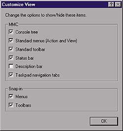 Состав элементов строки меню и иконок в инструментальной панели окна консоли зависит от интегрируемых компонентов, образующих данную консоль. В меню Action входят команды, доступные для загруженной консоли, а интегрируемые компоненты видоизменяют это меню, добавляя или убирая пункты по мере необходимости. В меню View вводятся элементы отображения объектов интегрированных компонентов. В это меню входит и команда Customize, открывающая диалоговое окно Customize View, в котором можно устанавливать варианты настроек для обоих окон, как показано на Экране 2. Однако отменять выбор пункта Standard menus (Action and View) здесь нужно крайне осторожно. Однажды удалив этот пункт, вернуться в диалоговое окно Customize View для внесения каких-либо изменений уже не удастся. При работе в окне консоли с помощью комбинации клавиш Alt+Enter выводится диалоговое окно Properties для выделенных элементов, а кнопкой F5 обновляется содержимое окна.