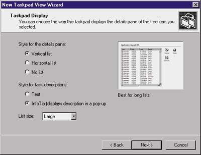 Мастер New Taskpad View Wizard позволяет настроить параметры отображения элементов интегрируемых объектов и задач (или, иными словами, ярлыков команд, программ и проч.), как это показано на Экране 5. При желании, например, можно отобразить текстовые описания задач, включенных в панель, или создать всплывающие подсказки для доступных пользователю элементов. Мастер позволяет автоматически использовать создаваемый вид панели задач для объектов того же типа, что и выбранный.