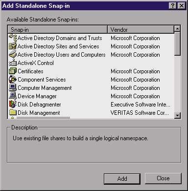 В системе Windows 2000 интегрируемый компонент может быть включен в состав новой или уже существующей консоли. Чтобы открыть файл консоли, нужно выбрать меню Start/Run и ввести в нем mmc. В окне ММС откроется пустая консоль. Чтобы разместить в ней новый компонент, необходимо открыть меню Console и выбрать в нем элемент Add/Remove Snap-in. При нажатии Add появится список автономных компонентов, показанный на Экране 4. Выбранный интегрируемый компонент двойным щелчком мыши добавляется в новую консоль и становится корневым объектом пространства имен (Console Root). Дополнительные компоненты могут добавляться в уже существующий корневой компонент или создаваться в качестве нового корневого компонента.