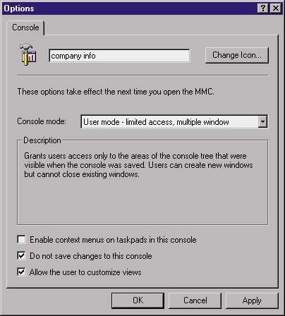 Даже разрешив пользователям непосредственную работу с файлами консолей, вместо их рассылки или предоставления доступа к панелям задач администратор может следить за тем, чтобы пользователи не нанесли большого ущерба содержимому ММС. Перед тем как консольный файл будет сохранен и предоставлен в общее пользование, нужно установить некоторые ограничения. В окне ММС следует выбрать элемент Options меню Console. Откроется диалоговое окно Options, изображенное на Экране 7. Теперь нужно выбрать один из описанных ниже режимов ниспадающего меню.