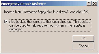 В данном диалоговом окне можно выбрать режим копирования файлов реестра. Это нужно делать всегда, чтобы на диске сохранялась последняя версия важнейших файлов конфигурации. Дело в том, что Windows 2000 располагает двумя наборами файлов реестра. В процессе инсталляции оригиналы файлов реестра помещаются в каталог \%systemroot% epair. Когда создается аварийный диск и выбран режим копирования реестра, утилита Backup сохраняет файлы ветви SYSTEM и в каталоге \%systemroot% epair egback. С помощью консоли RC можно восстановить текущую (а не исходную) версию важнейших файлов реестра, используя файлы, помещенные утилитой Backup в каталог egback. После того как процесс создания диска аварийного восстановления и копирования реестра завершен, утилита Backup выводит на экран подтверждение.