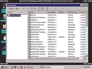 После того как режим (Safe Mode) выбран, процедура Startup возвращает систему в загрузочное меню, из которого нужно выбрать конкретную установку Windows 2000 (если на машине установлен не один экземпляр системы). Затем на экране прокручивается длинный список файлов, соответствующих загружаемым компонентам операционной системы. Загрузка в режиме Safe Mode занимает больше времени, чем обычная загрузка, поэтому следует запастись терпением, ожидая приглашения к началу работы.