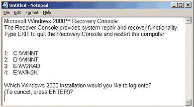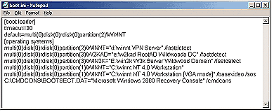 Затем, открыв boot.ini.bak в текстовом редакторе (например, Notepad, Word-Pad), следует удалить строку, содержащую текст Windows 2000 Recovery Console, и сохранить файл с настоящим именем boot.ini.