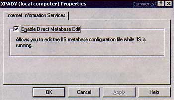 Одна из наиболее полезных функций управления IIS 6.0 — Edit-while-running; с ее помощью можно редактировать файл metabase.xml в процессе работы IIS. После того как файл будет сохранен, изменения вступают в силу незамедлительно, без перезапуска сервера. Чтобы протестировать эту функцию, необходимо активизировать Edit-while-running на служебном уровне IIS. В оснастке Internet Information Services консоли Microsoft Management Console (MMC) следует щелкнуть правой кнопкой мыши на сервере, а затем выбрать пункт Properties. На закладке Internet Information Services нужно установить флажок Enable Direct Metabase Edit (см. Экран 3). По умолчанию эта функция отключена, вероятно, из-за опасения, что пользователь с правом записи может сделать ошибку.