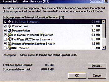 Многие специалисты по ИТ будут рады, что остальные три продукта .NET Server по умолчанию не устанавливают IIS (IIS часто бывает объектом нападений, особенно в системах Windows 2000, которые стандартно поддерживают работающий IIS, даже если сервер предназначен для использования в качестве контроллера домена, DC). Конечно, .NET Web Server развертывает IIS 6.0 по умолчанию. В раскрывающемся списке Install optional Windows components, естественно, отсутствуют компоненты, намеренно удаленные из состава .NET Web Server самой Microsoft.