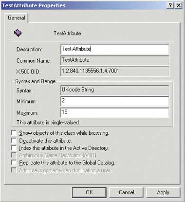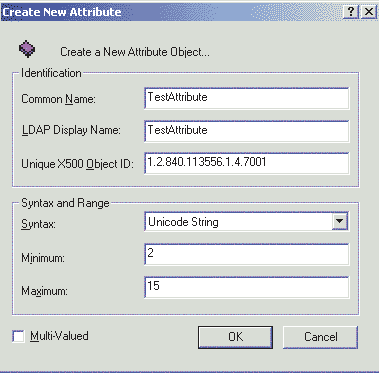 Параметр Sintax выбирается из стандартного набора Windows 2000 и зависит от назначения атрибута, его отображения в памяти, порядка байт и правил сравнения однотипных свойств. Здесь же определяются значения атрибута: строка, число или единица времени.