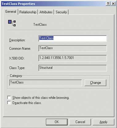 Некоторые параметры стандартных и созданных классов можно изменять, вызвав команду Properties для нужного класса (см. Экран 5). Так, на закладке General («Общие») можно изменить категорию класса и в случае возникновения неполадок схемы данный класс отключить (для стандартных классов эти два параметра недоступны, они существуют лишь для вновь созданных классов). На закладке Relationship («Отношения») к существующему классу можно добавить дополнительные классы для расширения атрибутов, а также указать классы, которые могут назначаться родителями для любого из данных классов.