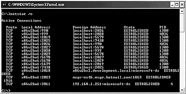Я нередко отмечаю повышенную активность брандмауэра/маршрутизатора. Работая с прежними версиями Windows, я использовал утилиту Netstat (netstat.exe), чтобы выяснить, какие конечные точки TCP или UDP задействованы на моей системе, а затем пытался мысленно найти процесс или процессы, которые посылают и принимают данные. Но если необходимо установить точное соответствие между конечными точками и процессами, то приходится пользоваться инструментами независимых поставщиков. В обновленном инструменте Netstat появилась функция, с помощью которой можно определить, какие процессы взаимодействуют с теми или иными компьютерами. Команда Netstat с ключом /o показывает идентификатор процесса (PID) наряду с информацией о конечной точке (см. Экран 2). Благодаря ключу /a можно увидеть все конечные точки, как активные, так и находящиеся в режиме прослушивания.
