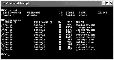 Пользователям Windows 2000 Server Terminal Services или NT Server 4.0, Terminal Server Edition знакома утилита командной строки Query (query.exe). В состав XP входит разновидность Terminal Services, но нет Query. Аналогичную информацию можно получить с помощью других команд (query.exe вызывает эти команды). Например, чтобы получить список пользователей, зарегистрированных на системе XP, следует обратиться к инструменту командной строки Qwinsta (qwinsta.exe), как показано на Экране 3. Благодаря аргументу /server:servername можно опрашивать пользователей на удаленных системах, работающих с Terminal Services или XP. Инструмент командной строки Qprocess (qprocess.exe) показывает список процессов, запущенных каждым зарегистрированным пользователем. Как и команда Qwinsta, Qprocess позволяет посылать удаленным машинам запросы о принадлежащих пользователям процессах.