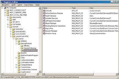 Алгоритм работает следующим образом. Утилита ntbackup.exe начинает процедуру восстановления с обращения к разделу реестра HKEY_LOCAL_MACHINESYSTEMCurrentControl SetControlBackupRestoreKeysNotToRestore (См. Экран 1). Значения этого раздела указывают ntbackup.exe, данные каких подразделов из раздела HKEY_LOCAL_MACHINESYSTEM необходимо сохранить для восстановления системы (раздел HKEY_LOCAL_MACHINESYSTEM содержит информацию о системной конфигурации, в том числе инсталлированных и работающих службах и драйверах). Если подраздел в данном разделе содержит данные, заканчивающиеся обратной наклонной чертой (), то подраздел защищен, и ntbackup.exe не будет восстанавливать значения ниже этого подраздела. Но если данные подраздела заканчиваются обратной наклонной чертой со звездочкой (*), то ntbackup.exe объединяет подразделы исходной и целевой систем. Для этого используется набор заранее определенных правил на основе параметра start. Этот параметр определяет, следует ли запускать соответствующую службу или драйвер, и приоритет запуска (в процессе начальной загрузки, системный, автоматический, ручной или блокирован). Целевой подраздел имеет преимущество, если значение его параметра start меньше, чем в подразделе источника.