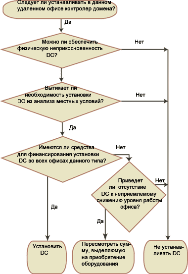 На рис. 1 представлены основные этапы процесса принятия решения относительно размещения контроллера домена и различные аспекты этого процесса. Если вы можете гарантировать физическую безопасность потенциального контроллера домена в случае установки его в данном офисе (анализ безопасности), необходимо определить, существует ли в этом офисе реальная потребность в контроллере домена (анализ трафика). Если в компании имеется несколько филиалов того же типа, что и наш эталонный офис, вероятно, их следует сконфигурировать так же, как и данный офис, а затем определить, может ли фирма позволить себе иметь контроллер домена в каждом из аналогичных офисов (анализ затрат). Нужно помнить о том, что затраты включают в себя расходы на оборудование, оплату поддержки от поставщиков и затраты на управление. Если вы сочтете уровень затрат приемлемым, размещайте контроллеры доменов в соответствии с результатами анализа трафика. Если же затраты слишком велики, стоит пересмотреть результаты анализа. Возможно, некоторые малые офисы могут функционировать и без контроллеров доменов. Если же вы не можете обойтись полученными на обустройство контроллеров средствами без неприемлемого снижения производительности или отказоустойчивости, придется вновь поставить вопрос о бюджете или начать готовиться к неприятностям в будущем.