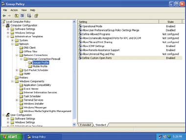 Помимо графического интерфейса и командной строки, отключить Windows Firewall в XP SP2 можно из редактора Group Policy Editor (GPE) с помощью локальной или доменной политики. Брандмауэр всегда можно было отключить из объекта Group Policy Object (GPO), но этот метод очень ограниченный — отключение брандмауэра было фактически единственной функцией. В SP2 появилась новая категория (папка) объектов GPO для управления Windows Firewall.