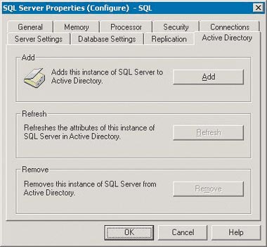 Чтобы добавить SQL Server из Enterprise Manager, следует открыть Server Properties, выбрать вкладку Active Directory и щелкнуть Add (см. экран 1).