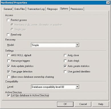 Чтобы добавить Northwind из Enterprise Manager, требуется открыть Northwind Properties, перейти на вкладку Options и установить флажок List this database in Active Directory в нижней части экрана (см. экран 2).