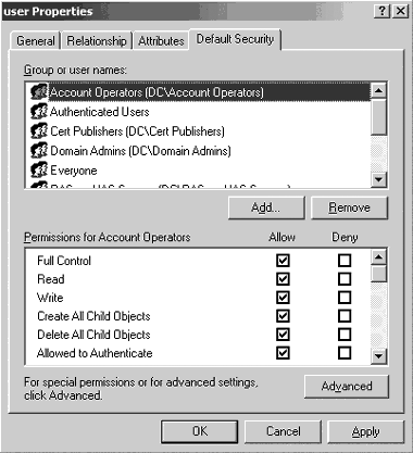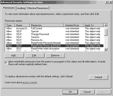 На экране 7 показаны разрешения, присваиваемые по умолчанию субъекту безопасности Self для класса объектов User. При изменении стандартного дескриптора безопасности класса объектов только объекты, созданные после изменения, будут иметь обновленные разрешения.