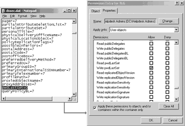 Чтобы отобразить атрибуты pwdLastSet и lockoutTime учетной записи user в расширенном виде редактора ACL на системах Windows 2000, требуется отредактировать файл конфигурации dssec.dat. Атрибутам lockoutTime и pwdLastSet необходимо присвоить значение 0 (по умолчанию выбирается значение 7). На экране 5 показано, как после установки pwdLastSet в значение 0 в файле dssec.dat разрешения Read pwdLastSet и Write pwdLastSet становятся видимыми в редакторе ACL.