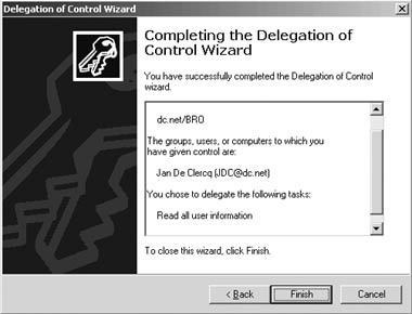 Делегировать административные полномочия удобно с помощью мастера Delegation of Control компании Microsoft. На экране 2 показан заключительный экран мастера, на котором приведена сводка переданных полномочий. Мастер доступен на уровнях сайта, домена и OU из оснасток Active Directory Users and Computers и Active Directory Sites and Services консоли Microsoft Management Console (MMC). С помощью мастера Delegation of Control администратор может выбрать заранее определенный набор задач делегирования, перечисленных в таблице 1. Можно создать специализированные задачи, которые более точно отражают потребности конкретной организации, если сформулировать задачу в мастере Delegation of Control, или описать ее заранее, а затем передать мастеру.