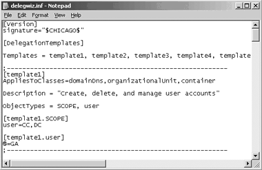 Чтобы передать заранее сформулированную задачу мастеру Delegation of Control, необходимо изменить файл настройки delegwiz.inf. На экране 3 показан фрагмент этого файла, находящегося в каталоге %windir%/inf. Синтаксис, который необходимо использовать при настройке списка задачи, разъясняется в статье Microsoft «How to customize the task list in the Delegation Wizard,» http://support.microsoft.com/?kbid=308404.