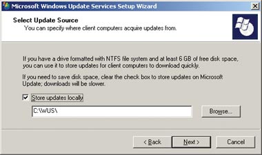 В самом начале установки требуется ответить на вопрос, будет ли WSUS хранить обновления, получаемые от Microsoft. Можно выбрать один из двух вариантов — хранить обновления на самом сервере WSUS или рассчитывать на то, что клиенты будут самостоятельно обращаться за ними на сервер Microsoft (см. экран 1). Мне представляется, что дисковое пространство — ресурс исключительно недорогой, в отличие от пропускной способности Internet. Если в организации насчитывается несколько тысяч рабочих станций, попробуйте себе представить, что произойдет, если все они одновременно попытаются загрузить свежие исправления по Internet. Предположим, что для хранения исправлений выбирается локальный каталог на сервере WSUS. Необходимо убедиться, что в указанном каталоге в вашем распоряжении имеется по крайней мере 6 Гбайт свободного дискового пространства. В момент публикации загрузка полного комплекта исправлений (включая поддержку всех языков) потребует около 2 Гбайт дискового пространства.
