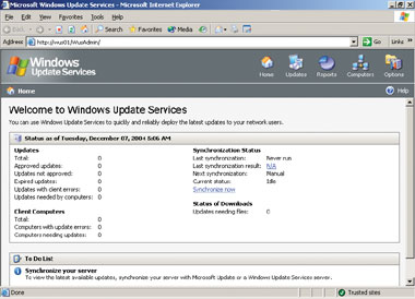 Интерфейс WSUS содержит пять зон, которые показаны вверху справа как пять значков: Home, Updates, Reports, Computers и Options. Понятно, что, когда WSUS запускается впервые, нет еще никаких обновлений, которые можно было бы принять или отклонить (если только не была произведена модернизация от SUS). В списке обновлений на начальной странице везде должны стоять нули (экран 3). Следовательно, прежде всего требуется настроить WSUS на получение всех необходимых обновлений. Но прежде чем нажимать на Synchronize now, следует настроить параметры WSUS.