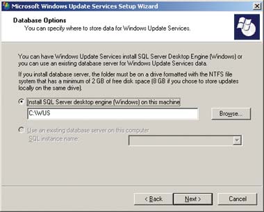 WSUS дополнительно нужно 2 Гбайт дискового пространства для размещения собственной базы данных SQL Server, которую WSUS использует для отслеживания служебной информации — например, какие исправления загружены, но не развернуты, каким образом сгруппированы машины, какие исправления (и на каких системах) были успешно развернуты и т. д. Для работы с этой базой данных полновесная система SQL Server в организации не нужна (хотя, конечно, если она уже есть, ею стоит воспользоваться); для WSUS можно задействовать настольный вариант SQL Server, как показано на экране 2.
