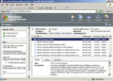 Для того чтобы решить проблему заказчиков с поддержанием систем в актуальном состоянии с точки зрения установленных исправлений, Microsoft выпустила Software Update Services (SUS), продукт, который позволяет администраторам установить в организации собственный сервер Windows Update. Благодаря тесной интеграции SUS с клиентом Automatic Updates, установленным на каждом сервере и рабочей станции компании, для развертывания новых исправлений для Windows и связанных с ней компонентов достаточно просто поставить галочки напротив исправлений, которые требуется установить. Серверы и рабочие станции воспринимали переданную информацию, и либо начиналась многоэтапная процедура развертывания исправлений, либо исправления устанавливались немедленно — все зависело от настроек.