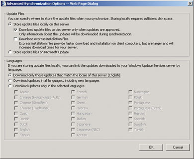 WSUS по умолчанию сама устанавливает некоторые параметры, и одна из этих настроек подразумевает, что будут загружаться все доступные исправления для всех возможных языков. Это приведет к исключительно длительной загрузке на начальном этапе работы WSUS. Если развертываются все языковые версии Windows 2003, Windows XP и Windows 2000, эта настройка может оказаться полезной. Но для большинства сайтов это не так и, следовательно, приведет к бесполезной трате огромного объема дискового пространства (не говоря уже о пропускной способности сайта Microsoft WSUS). Итак, следует выбрать для своей организации только необходимые языки. Для этого нужно щелкнуть значок Options, а затем выбрать Synchronization Options. Пролистайте секцию Update Files and Languages и щелкните Advanced — появится окно, как на экране 4.