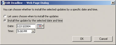 При назначении конечного срока для развертывания исправления в распоряжении администратора есть три возможности: позволить пользователю применить исправление в любое время (на его усмотрение); позволить пользователю применить исправление в любое время, но по истечении заданной даты и времени приступить к принудительной установке; установить исправление немедленно. Чтобы пользователь мог установить исправление в любое время, нужно просто оставить в поле Deadline значение None. Чтобы гарантировать, что к указанному времени пользователь обязательно установит исправление, необходимо ввести в окне Edit Deadline нужную дату. После того как время назначенного срока истекло, от пользователя в обязательном порядке потребуется установка исправления. И наконец, если исправление нужно развернуть по всей организации в максимально сжатые сроки, просто задайте текущую дату и время, и тогда на всех системах начнется установка обновлений.
