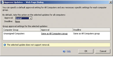 По умолчанию для всех обновлений статус одобрения имеет значение Detect, если только в политике синхронизации не было установлено, что изменения получают автоматическое одобрение. Исправления со статусом одобрения Detect будут просто инспектировать целевые системы для проверки, требуется ли в системе то или иное исправление, и результат этой проверки будет фиксироваться. Чтобы одобрить исправление для распространения, нужно выбрать Install вместо Detect, и исправление начнет распространяться по всей организации. Для некоторых исправлений разработчики Microsoft даже обеспечили возможность удаления, для чего из списка Approval достаточно выбрать параметр Remove. Вместе с тем WSUS не может автоматически удалить исправления, которые не поддерживают возможности удаления (обратите внимание на экран 6); для таких исправлений параметр Remove не отображается.