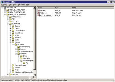 Затем следует вернуться в HKEY_LOCAL_MACHINE SOFTWAREPoliciesMicrosoftWindowsWindowsUpdate, добавить в раздел WindowsUpdate два новых параметра, WUServer и WUStatusServer (тип данных обоих REG_SZ). Присвойте обоим параметрам URL сервера WSUS (см. экран 8). Эти значения сообщают Automatic Updates, по какому адресу можно найти сервер WSUS.