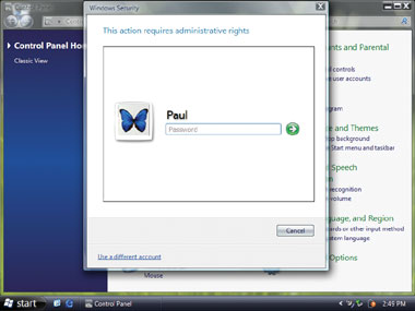 Защита учетной записи пользователя (User Account Protection, UAP) работает следующим образом. При попытке выполнить действие, требующее более высоких привилегий, система безопасности Windows выдает диалоговое окно с запросом на ввод пароля (см. экран). Пользователь, обладающий административными привилегиями, может ввести пароль собственной учетной записи. В противном случае можно ввести пароль другой учетной записи с необходимыми привилегиями.